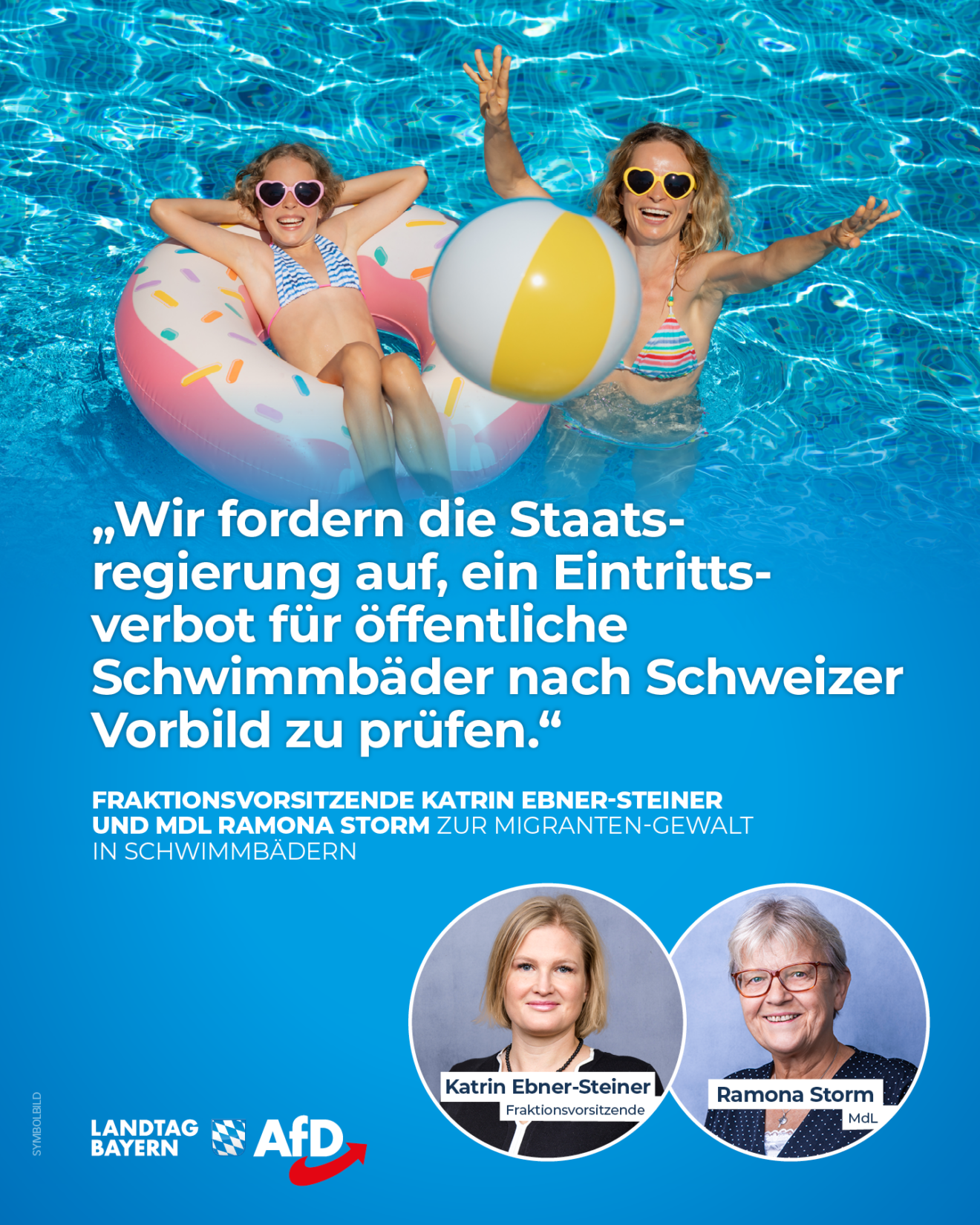 In einem Dringlichkeitsantrag unter dem Titel „Sommer, Sonne, sexuelle Belästigung? Harte Strafen, Remigration und Freibadverbot für Täter!“ fordert die AfD die Staatsregierung auf, sich auf allen Ebenen für eine zügige Remigration illegaler Migranten einzusetzen. Außerdem ist zu prüfen, welche Bedingungen für ein landesweites Eintrittsverbot in öffentliche Schwimmbäder bestehen. Und schließlich möchte die AfD-Fraktion den Kommunen ermöglichen, einen Asylnotstand zu erklären. Dieser soll ihnen erlauben, die Aufnahme weiterer Asylbewerber wegen Überlastung abzulehnen.
