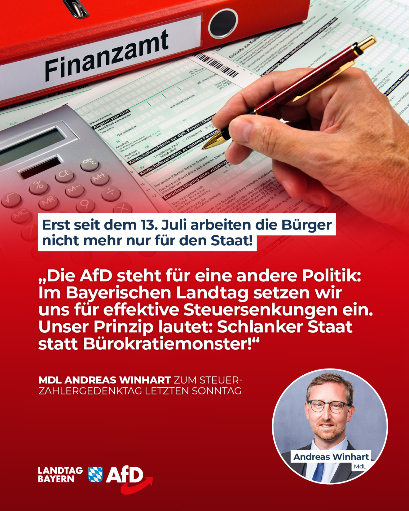 Der durchschnittliche Steuerzahler arbeitet mehr als die Hälfte des Jahres für den Staat. Den größten Teil seines Einkommens muss er an den Fiskus abführen. Deutschland steht bei den Steuern und Abgaben an der Weltspitze. Die Belastung der Bürger ist viel zu hoch, unsere Unternehmen sind international nicht mehr wettbewerbsfähig. Trotz ihrer unersättlichen Geldgier produzieren Bundes- und Staatsregierung gigantische Schuldenberge. Nicht einmal bei der Stromsteuer wollen Merz und die Union die Bürger entlasten!