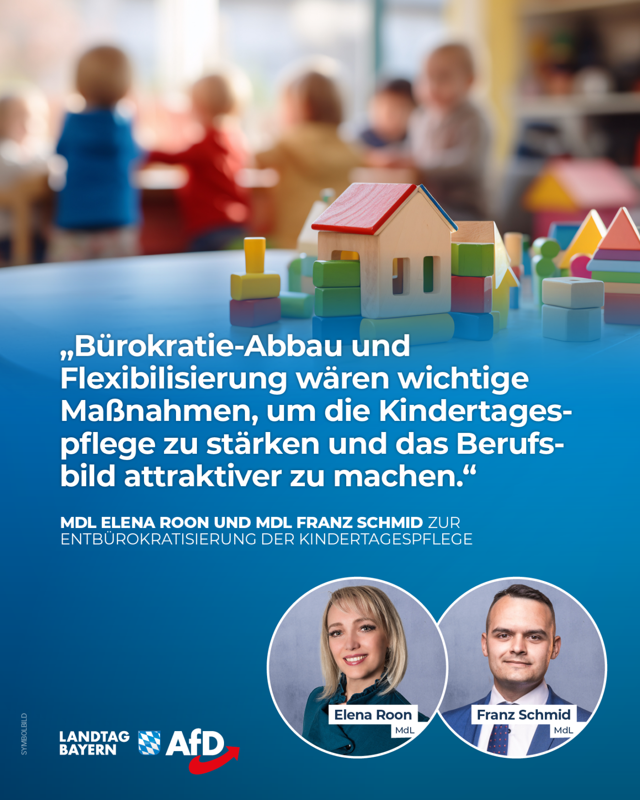 Die AfD-Fraktion setzt sich für eine Stärkung der Kindertagespflege in Bayern ein. Pädagogisch ausgebildete Fachkräfte bringen alle notwendigen Kompetenzen mit. Leider werden sie durch überflüssige Zusatzprüfungen ausgebremst. Bürokratie-Abbau und Flexibilisierung wären wichtige Maßnahmen, um die Kindertagespflege zu stärken und das Berufsbild attraktiver zu machen. Es ist unverantwortlich, dass die Altparteien die nötigen Reformen blockieren.
