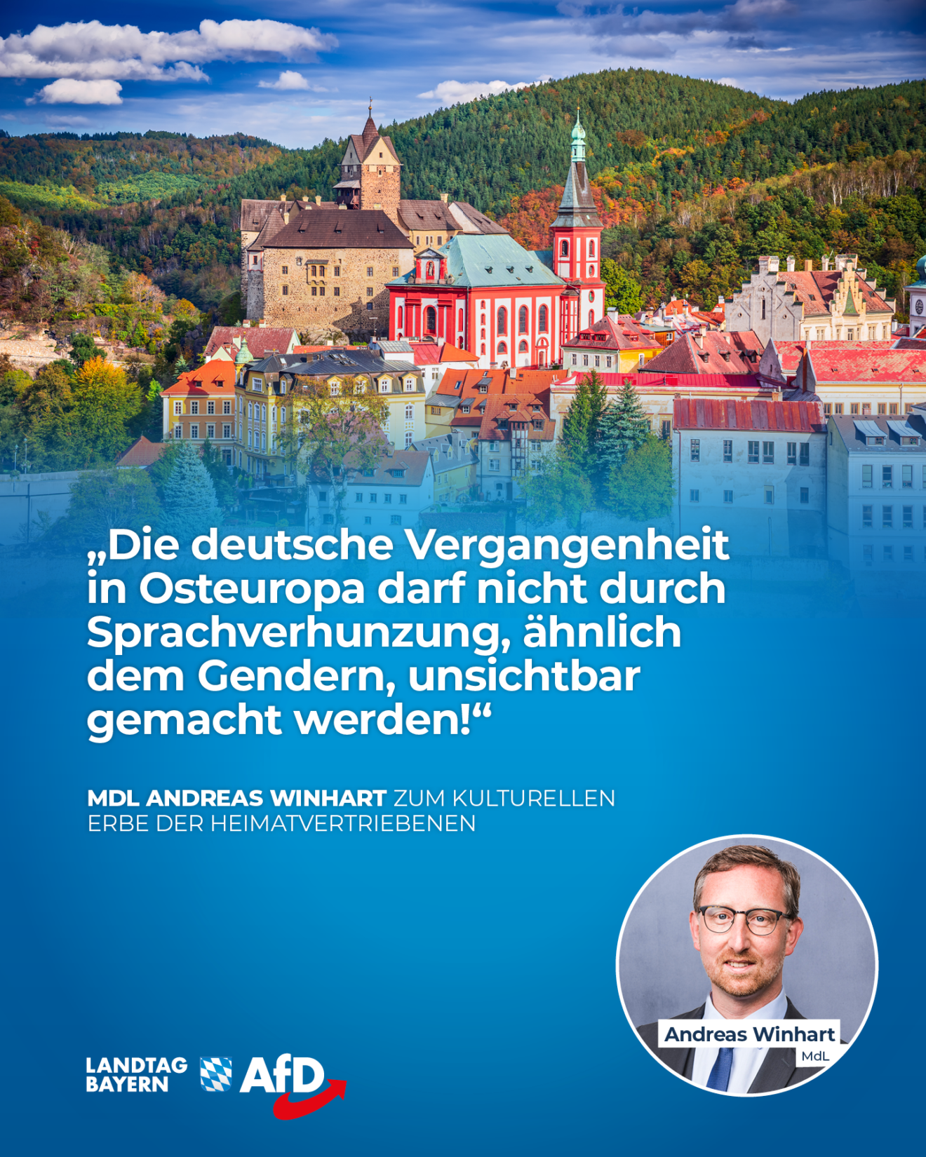 Die AfD-Fraktion hat kürzlich einen Dringlichkeitsantrag ins Plenum eingebracht. In diesem fordert sie die Bayerische Staatsregierung auf, das kulturelle Erbe der Heimatvertriebenen und Volksdeutschen zu bewahren und eine aktive Erinnerungsarbeit zu betreiben.